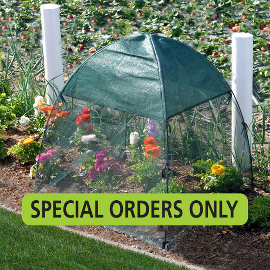 The Bug'N Shade 52" x 52" x 54" unique design reduces the amount of direct sunlight and filters it through the peak mid-day hours so that it helps prevent burning and drying out of the plant. In addition, it blocks out unwanted insects and small pests that can damage the plant. The fine mesh allows air, water and sunlight to penetrate, which is critical for plant life. A fiberglass frame supports the cover and easily pop open for quick installation and fold flat for compact convenient storage. Four (4) spikes are included for anchoring in the ground.